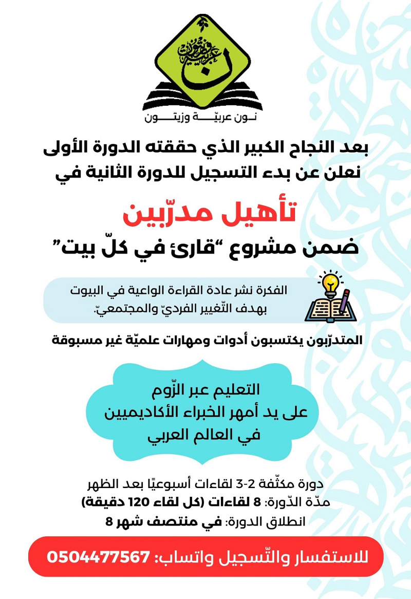 سارعوا للتسجيل.. بعد النجاح الكبير الذي حققته الدورة الاولى.. بدء التسجيل للدورة الثانية لتأهيل المدربين ضمن مشروع "قارئ في كل بيت"